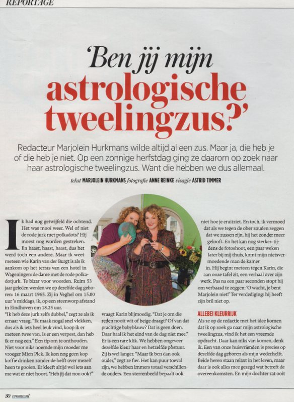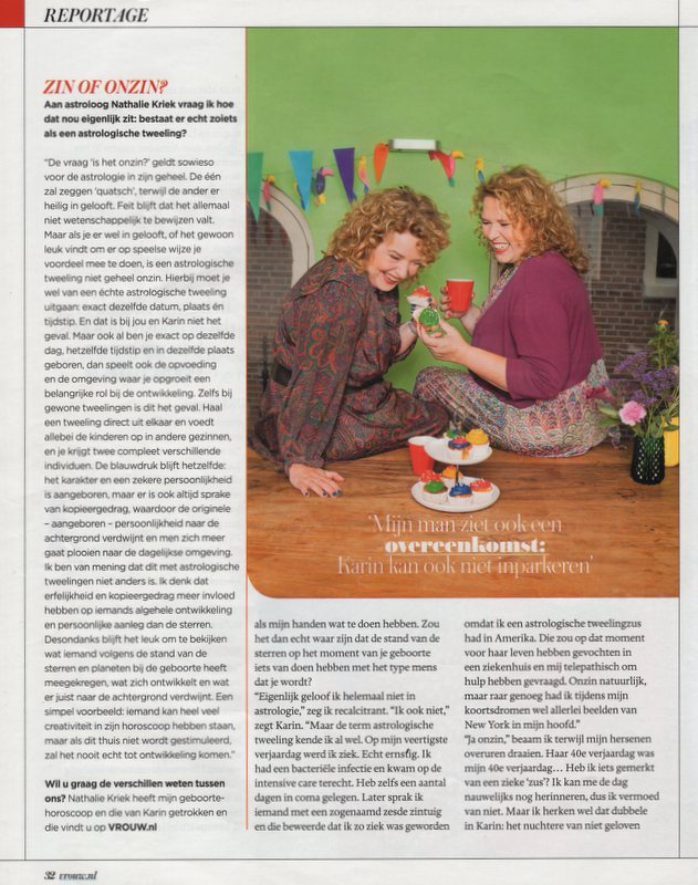 Een astrologische tweeling; bestaat dat überhaupt? VROUW journaliste Marjolein Hurkmans ging op onderzoek uit en vroeg mij hierbij om advies en opheldering. Haar verhaal inclusief mijn uitleg over de zin en onzin van astrologische tweelingen vindt u hier op deze pagina.