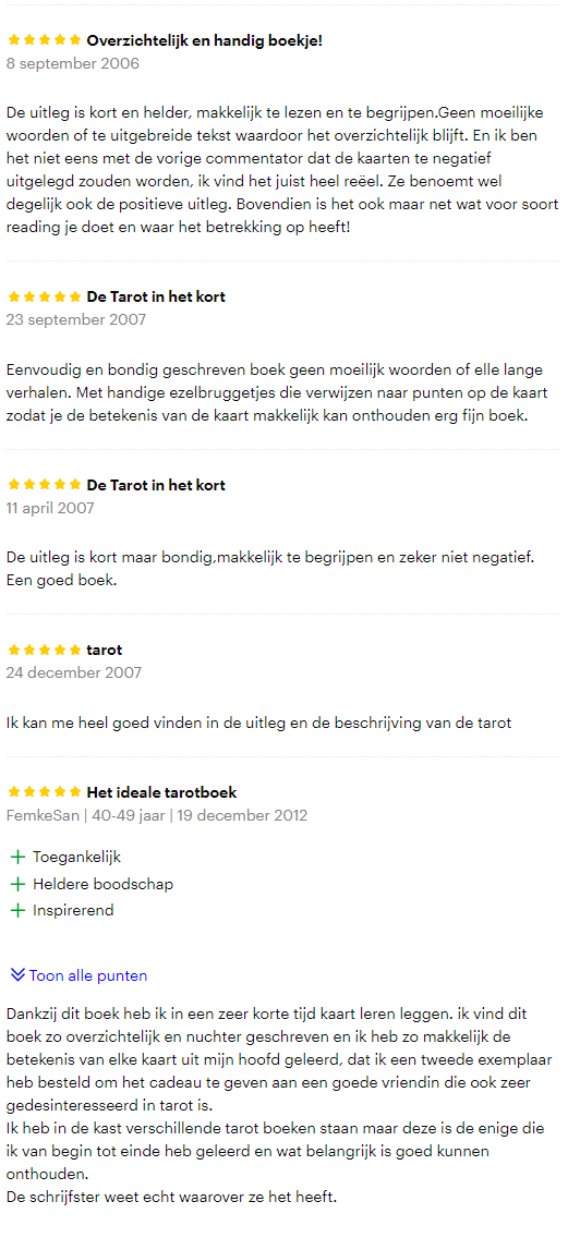 De Tarot in het kort is een korte, laagdrempelige en uiterst toegankelijke tarotcursus die de betekenis van de 78 tarot kaarten op een voor iedereen begrijpelijke wijze uitlegt. Stap voor stap leert u spelenderwijs hoe u de kaarten binnen enkele weken uit het hoofd leert, hetgeen belangrijk is wanneer u zelf tarot readings wilt gaan doen.