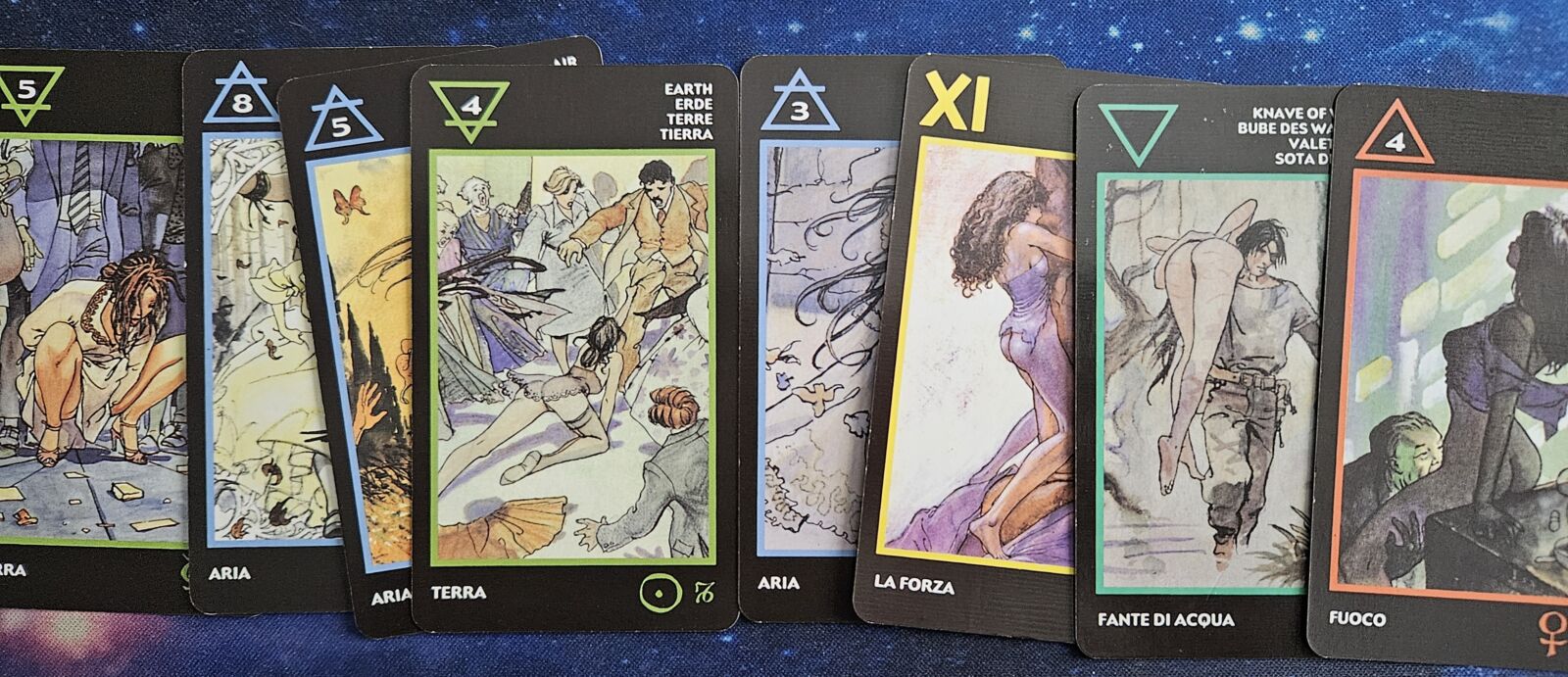 The Manara Tarot is also overwhelmingly a 'naughty' card deck of which many (not all) cards show sexual acts. Generally, these are erotic illustrations with some images showing the genitals. A few cards show bare breasts and/or buttocks.