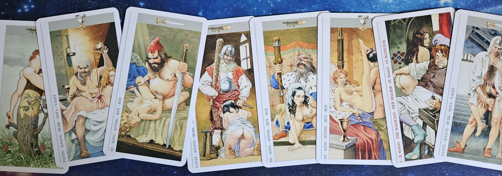 The Decameron Tarot is a playful erotic tarot deck where love is made exuberantly on several cards. On many cards, the pleasure drips off. Here and there, genitals can be seen. the acts, on the other hand, leave nothing to the imagination. Some people might label this deck as 'vulgar'.