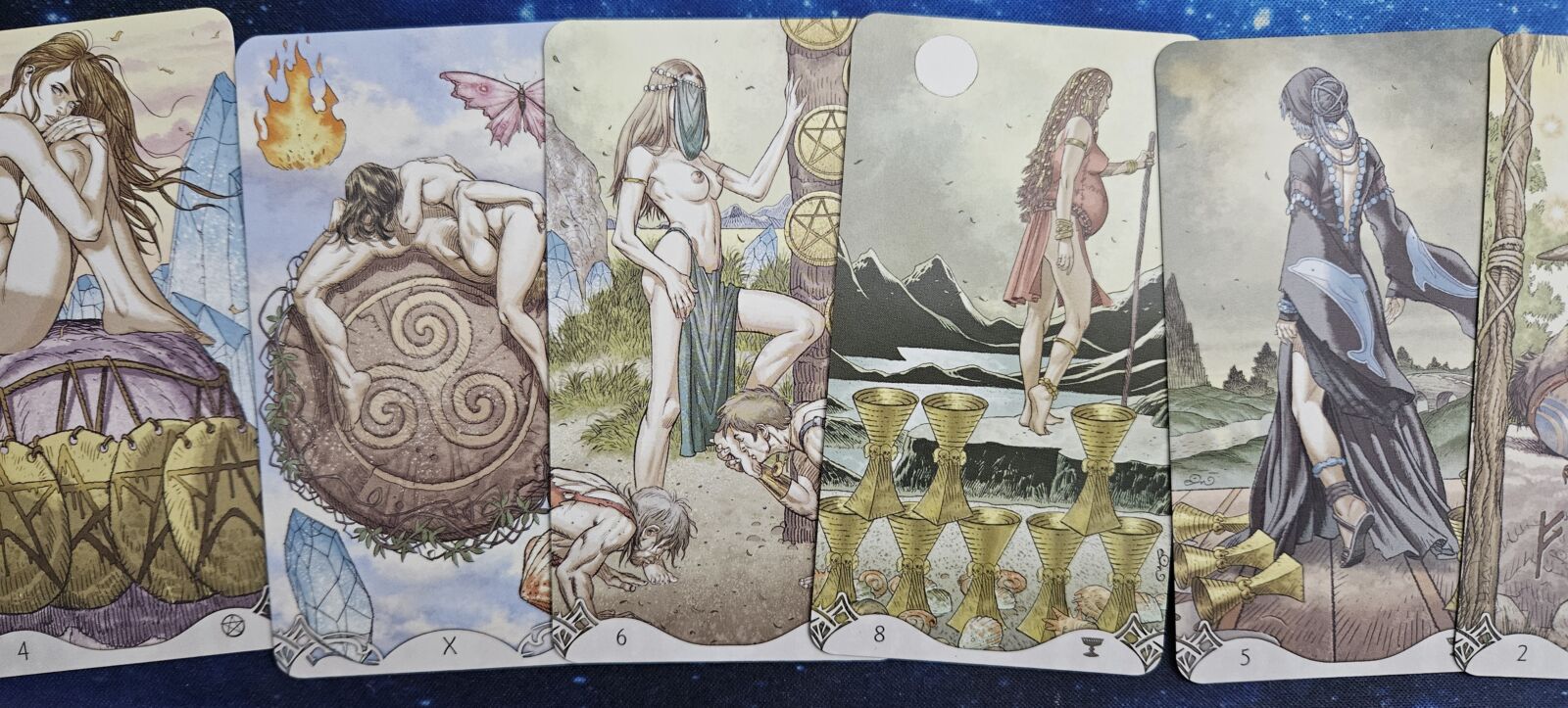 The Erotic Fantasy Tarot is a somewhat fairy-tale, magical, dreamy-looking deck with beautiful illustrations. The focus is mainly on beautiful, sexy ladies and sometimes a tough, muscular gentleman. Here and there, there is kissing. Although quite a few bare buttocks and breasts are shown, there is little talk of sex.
