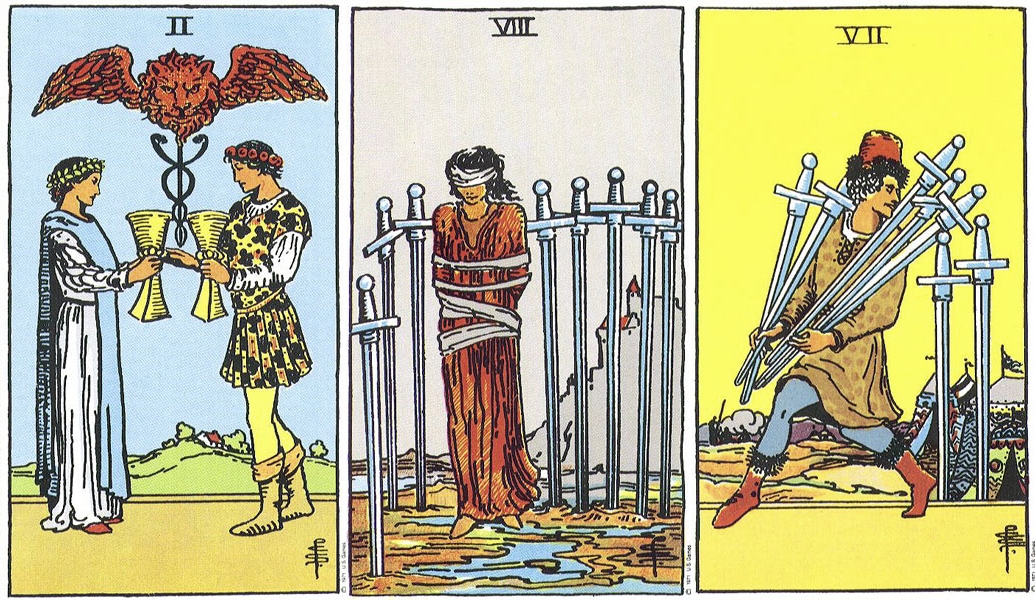 Symboliek: De persoon op de kaart lijkt niet te kunnen kiezen uit alle mogelijkheden die hem worden aangereikt, of die hij zelf bedenkt. Welke opties zijn haalbaar voor hem en welke niet? Deze kaart wijst op het gevaar van dromen die niet waargemaakt kunnen worden, misschien omdat ze te hoog gegrepen zijn en waardoor teleurstelling haast niet kan uitblijven.