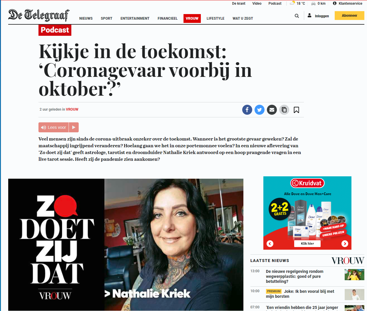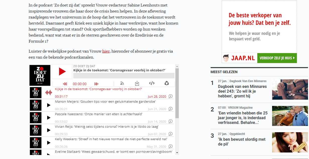 De VROUW Podcast ‘Zo doet zij dat’. Een gezellig gesprek met VROUW redacteur Sabine Leenhouts over de situatie tijdens en na de lockdown met het oog op de economie, sport, verkiezingen, mijn werk als astroloog/tarotist en mijn persoonlijke thuissituatie.